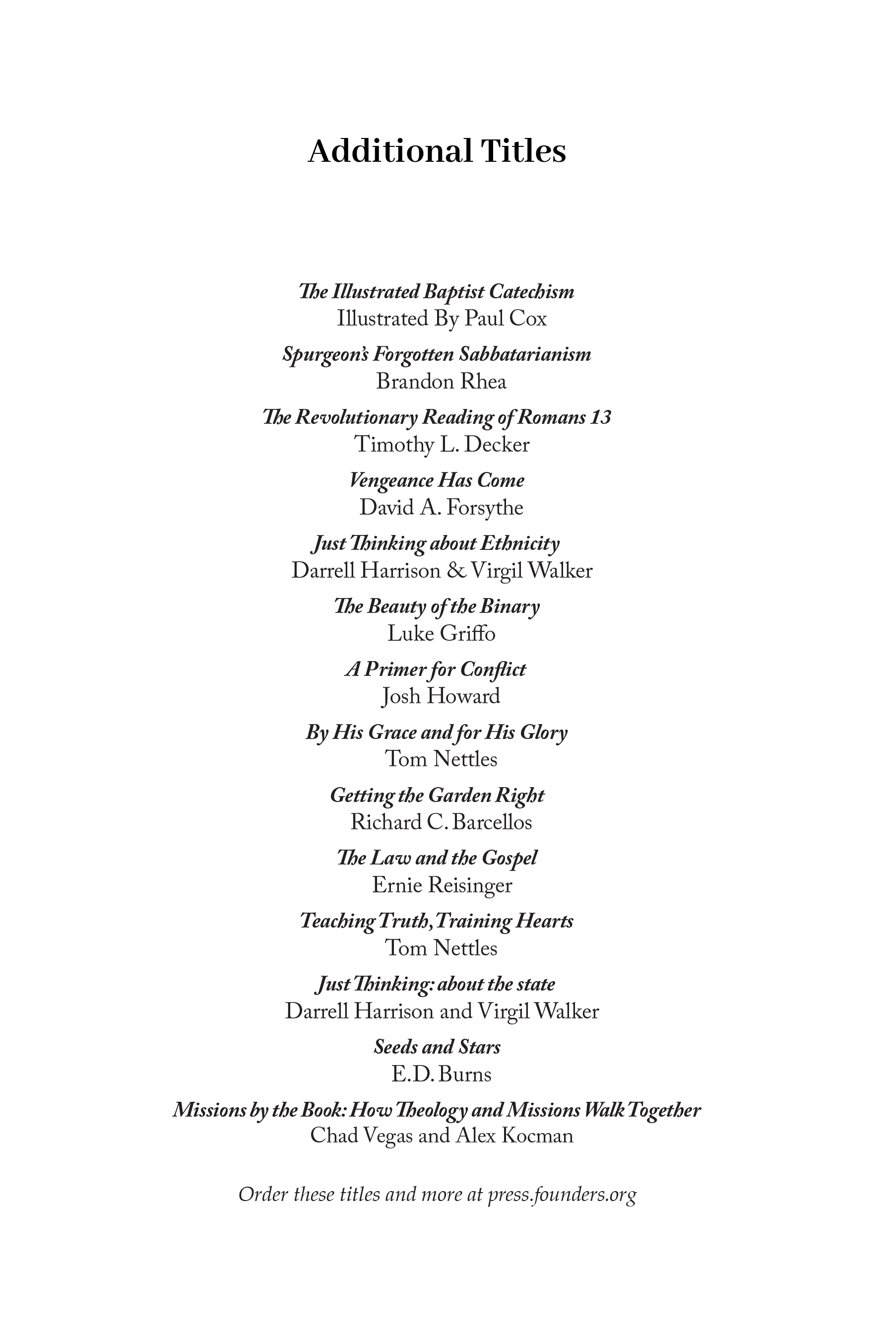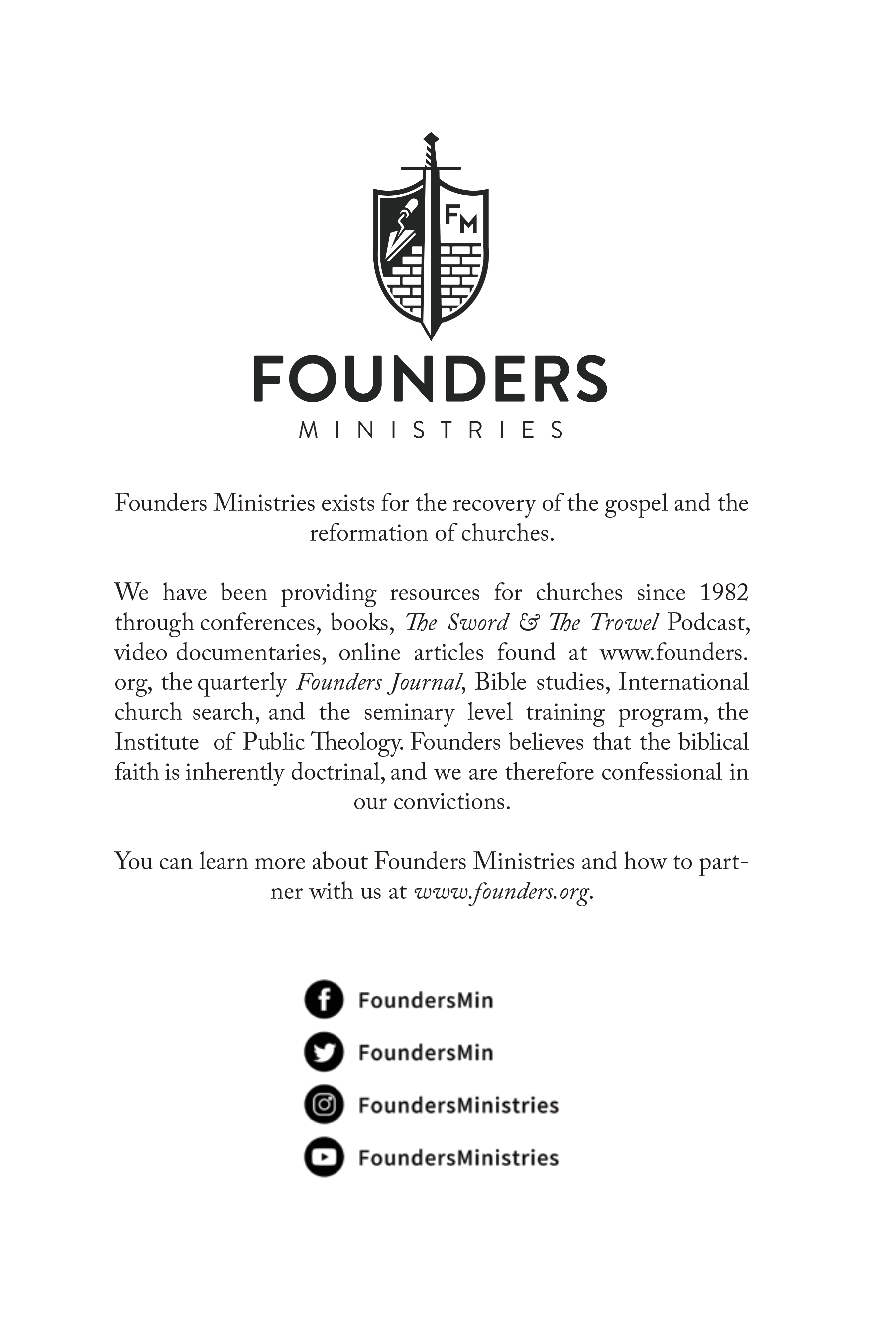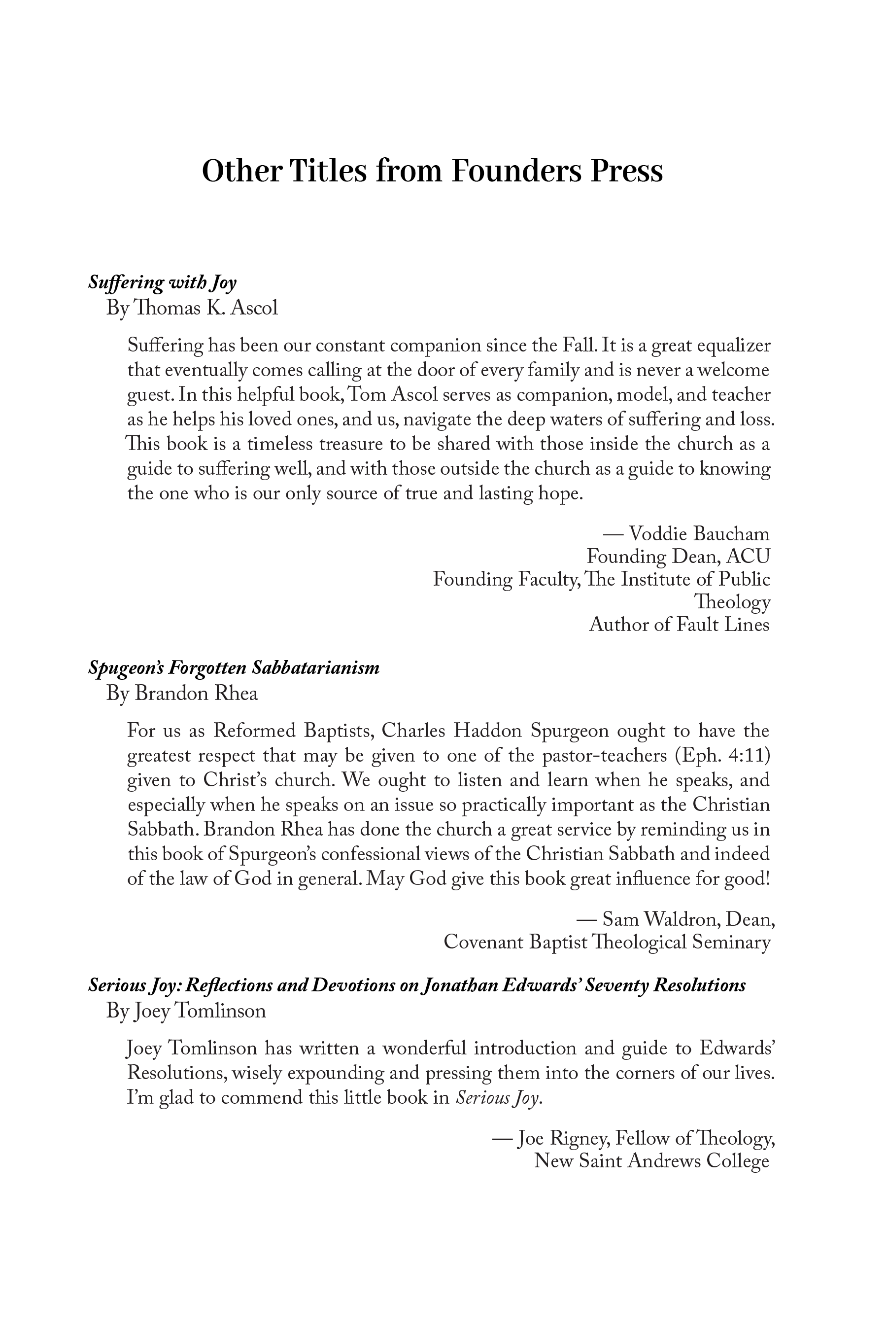 I would like to give special thanks to a number of people who helped me with the editing of various portions of this book, including Brandon Adams, Mitch Axsom, Jim Butler, Andrew Graham, D. Scott Meadows, Micah Renihan, and Caroline Williams. I am most grateful to Tom Ascol along with the other good brothers and sisters at Founders Ministries, who asked me to write on this subject and patiently worked with me as I wrote. I especially want to thank Fred Malone, my pastoral mentor, who taught me how to think pastorally and to apply Christ to His beloved people, and Tom Nettles, my doctoral supervisor, who taught me how all the doctrines of the faith are interconnected and integrated within Reformed Baptist theology. Above all, I am thankful for my wife, Joy, my beloved and my friend, who read every word of each draft and encouraged me along the way.